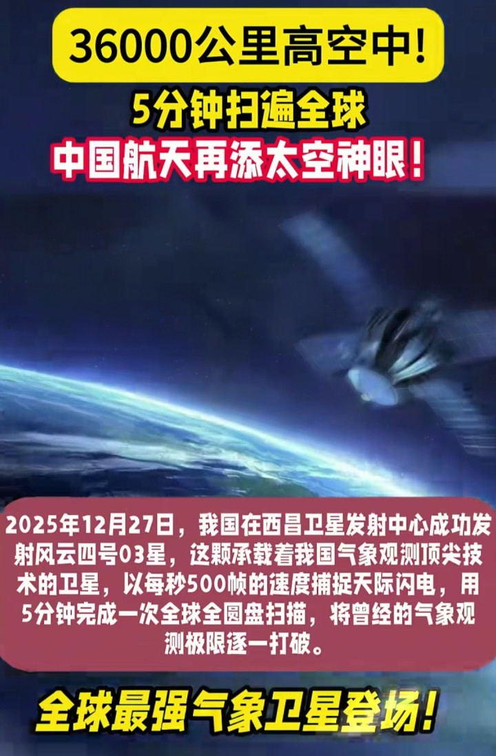 2025年12月27日,咱们国家在西昌卫星发射中心干了件大事——成功发射了风云四号03星!这颗卫星可不一般,它在36000公里的高空,给咱们的气象观测装上了“超级眼睛”。